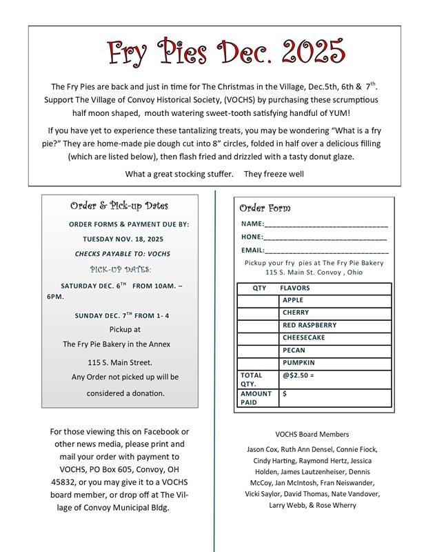 The Fry Pies are back and just in time for the Christmas in the village, Dec. 5th, 6th, and 7th. Support The Village of Convoy Historical Society (VOCHS) by purchasing these scrumptious half moon shaped, mouth-watering, sweet-tooth satisfying, handful of YUM!